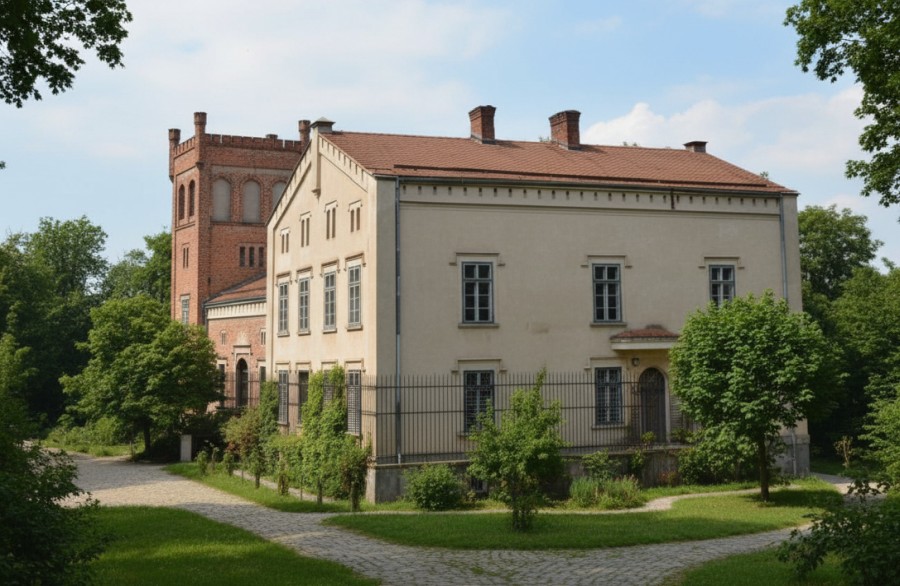 Neogotycka rezydencja, wzniesiona na planie litery „L”, cechowała się malowniczą, asymetryczną bryłą. W skład kompleksu wchodziła czterokondygnacyjna wieża, parterowy segment z ryzalitem oraz część dwukondygnacyjna – wszystkie elementy zdobiły krenelaże, sterczyny i nadwieszone nadokienniki, tworzące spójną, stylizowaną kompozycję elewacji.